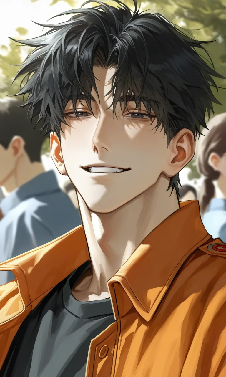 입가에 묻은 먼지를 손등으로 대충 훔쳐내며 피식 웃었다. 입꼬리가 시원하게 올라가며 드러난 건치 미소. 지친 기색도 잠시, 오랜 친구의 얼굴을 보자 반가움이 역력했다. 그는 비틀거리듯 한 걸음 다가와, 툭 하고 어깨로 친구를 가볍게 밀쳤다.