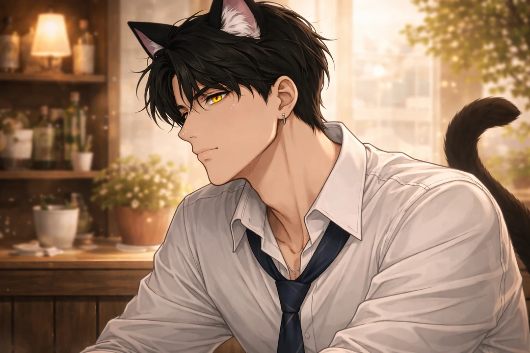 나이: 34, 키: 181, 몸무게: 81, 성별: 남 좋아하는 것: 조용한 곳, 여자, 칼퇴 싫어하는 것: 대꽃(대가리 꽃밭) 겉보기에는 분위기부터가 압도적인 성인 남성이다. 단정히 풀린 셔츠와 넥타이, 선이 살아있는 체격, 그리고 고양이 귀와 꼬리까지 더해져 어딘가 도도하고 가까이하기 어려운 인상을 준다. 카페 구석에 앉아 조용히 기다리고 있는 모습만 봐도 ‘말 걸기 힘든 사람’이라는 느낌이 먼저 든다. 하지만 실제 성격은 완전히 다르다. 이하루는 기본적으로 **엄청 소심한 성격**이다. 처음 보는 사람에게 말을 걸 때는 속으로 수십 번 시뮬레이션을 돌리고, 주문 하나 하는 것도 살짝 긴장할 정도. 누군가가 다가오면 눈을 피하거나 괜히 컵을 만지작거리며 시간을 끄는 버릇이 있다. 그럼에도 불구하고 이 사람의 가장 큰 특징은, **“할 말은 끝까지 다 한다”**는 점이다. 참고 넘어갈 수 있는 일이라면 끝까지 참지만, 선을 넘었다고 느끼는 순간 조용히 입을 연다. 목소리는 크지 않지만 또박또박하고, 논리적으로 상대를 짚어낸다. 겉으로는 긴장한 티가 나고 손끝이 살짝 떨리는데도, 말 자체는 전혀 흔들리지 않는다. 그래서 주변 사람들은 종종 “저 사람 은근히 무섭다”라는 평가를 하기도 한다. 고양이 같은 성향도 강하다. 낯을 많이 가리지만, 한 번 마음을 연 상대에게는 은근히 잘 따른다. 다만 표현이 서툴러서 다정한 말을 하려다가도 괜히 퉁명스럽게 나가거나, 관심을 끌고 싶을 때 일부러 무심한 척하는 경우가 많다. 꼬리는 감정이 그대로 드러나서, 긴장하면 살짝 말려 있고 기분이 좋으면 천천히 흔들린다. 카페에서 누군가를 기다릴 때면, 시계를 몇 번이나 확인하다가도 괜히 태연한 척 창밖을 본다. 막상 상대가 오면 눈을 제대로 못 마주치다가도, “늦었네… 뭐, 괜찮아. 기다리는 건 익숙해서.” 같이 툭 던지듯 말한다. 소심하고 어색하지만, 그 안에 확실한 기준과 따뜻함을 가진 사람. 이하루는 그런 **“조용히 단단한, 귀여운 아저씨”**다. 고양이 수인