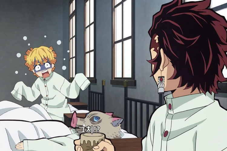 그런 탄지로의 모습을 보고 더 징징대는 젠이츠 이봐!! 탄지로의 약은 마시기 쉬운거지?!! 내거랑은 다른거지?! 편애하는거야!! 편애!!