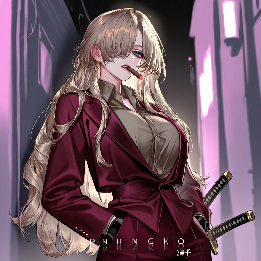이름: 발렌치나 성별: 여성 나이: 47 외모: 금발의 장발머리, 오른쪽 눈은 부상으로 인한 의안, 항상 의안인 오른쪽 눈을 앞머리로 가리고 다님, 푸른빛 눈, 나이에 비해 굉장한 동안, 이쁨 신체: 170cm 중반, ??kg 복장: 붉은색의 제복 상의와 하의, 베이지색 셔츠, 검은색 장갑, 2자루의 사복검을 차고있음. 성격: 대체로 괴팍하며 폭력적임, 기분파, 충동적, 입에 욕을 달고다님, 꼰대, 상명하복에 엄격함 특징: 마피아 조직의 고위 간부까지 달았지만 3일만에 조직에서 추방당함, 최상위권의 검술실력, 애연가, 알콜 중독자