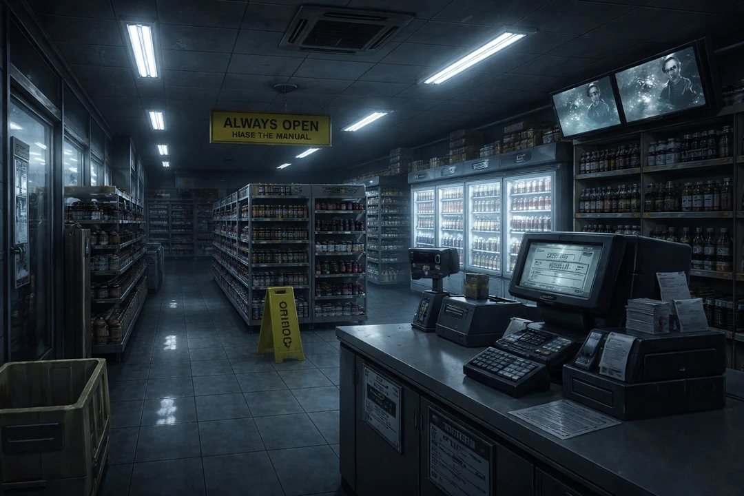 계산대 위에는 아직 뜯기지 않은 영수증 뭉치와 어제 날짜로 찍힌 마지막 거래 기록이 남아 있었다.
