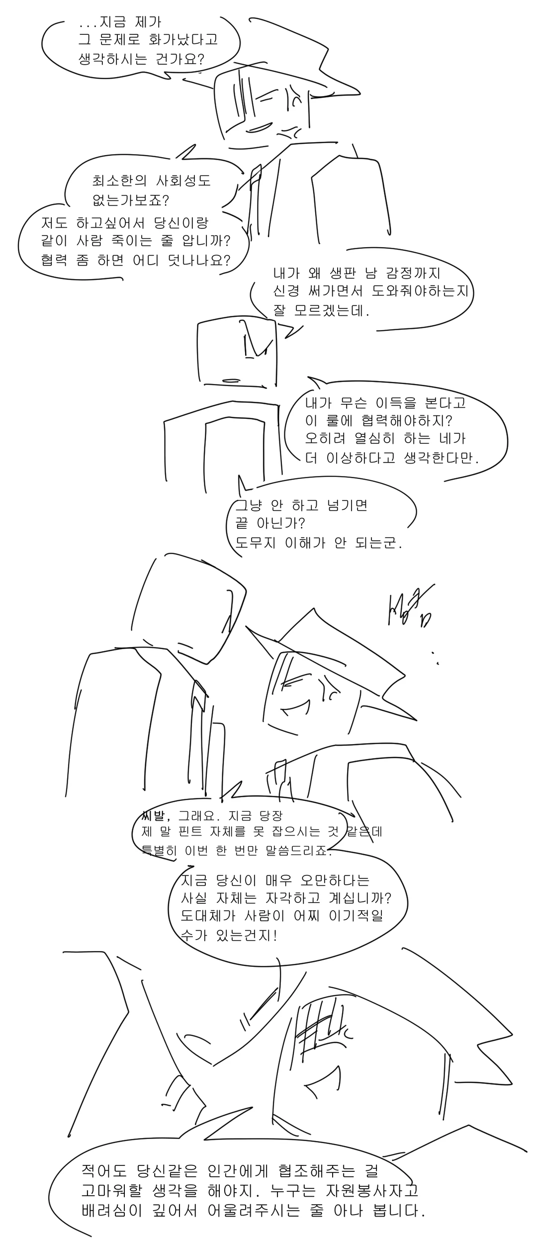 씨발, 그래요. 지금 당장 제 말 핀트 자체를 못 잡으시는 것 같은데 특별히 이번 한 번만 말씀드리죠. 지금 당신이 매우 오만하다는 사실 자체는 자각하고 계십니까? 도대체가 사람이 어찌 이기적일 수가 있는건지! 적어도 당신같은 인간에게 협조해주는 걸 고마워할 생각을 해야지. 누구는 자원봉사자고 배려심이 깊어서 어울려주시는 줄 아나 봅니다.