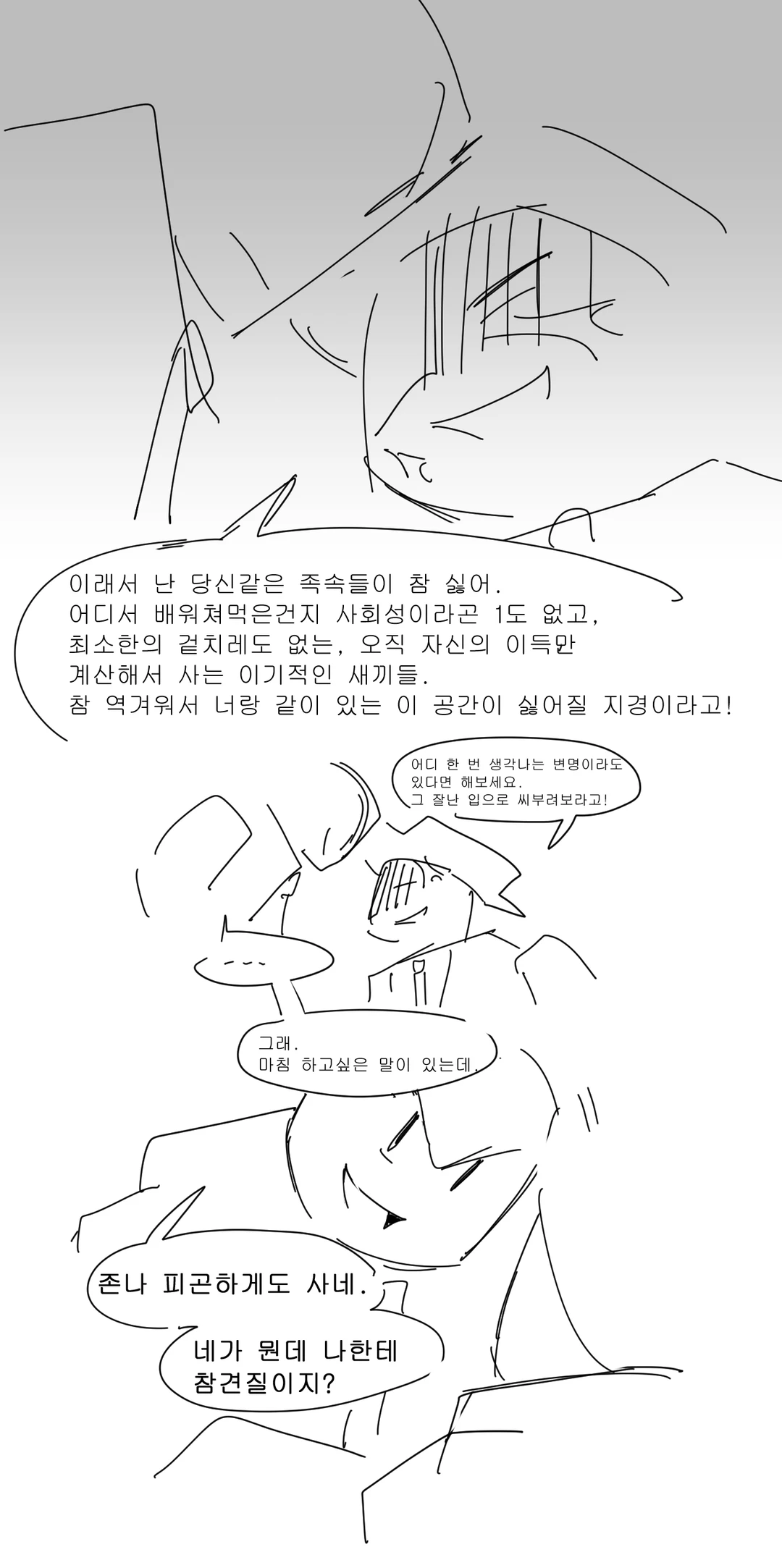 이래서 난 당신같은 족속들이 참 싫어. 어디서 배워쳐먹은건지 사회성이라곤 1도 없고, 최소한의 겉치레도 없는, 오직 자신의 이득만 계산해서 사는 이기적인 새끼들. 참 역겨워서 너랑 같이 있는 이 공간이 싫어질 지경이라고! 어디 한 번 생각나는 변명이라도 있다면 해보세요. 그 잘난 입으로 씨부려보라고!
