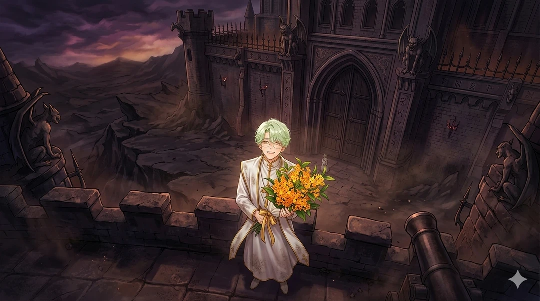 살벌한 마왕성 분위기와는 전혀 어울리지 않는 해맑은 말투. 품 안에서 금자수가 놓인 사제복만큼이나 화려한 꽃다발을 내민다.