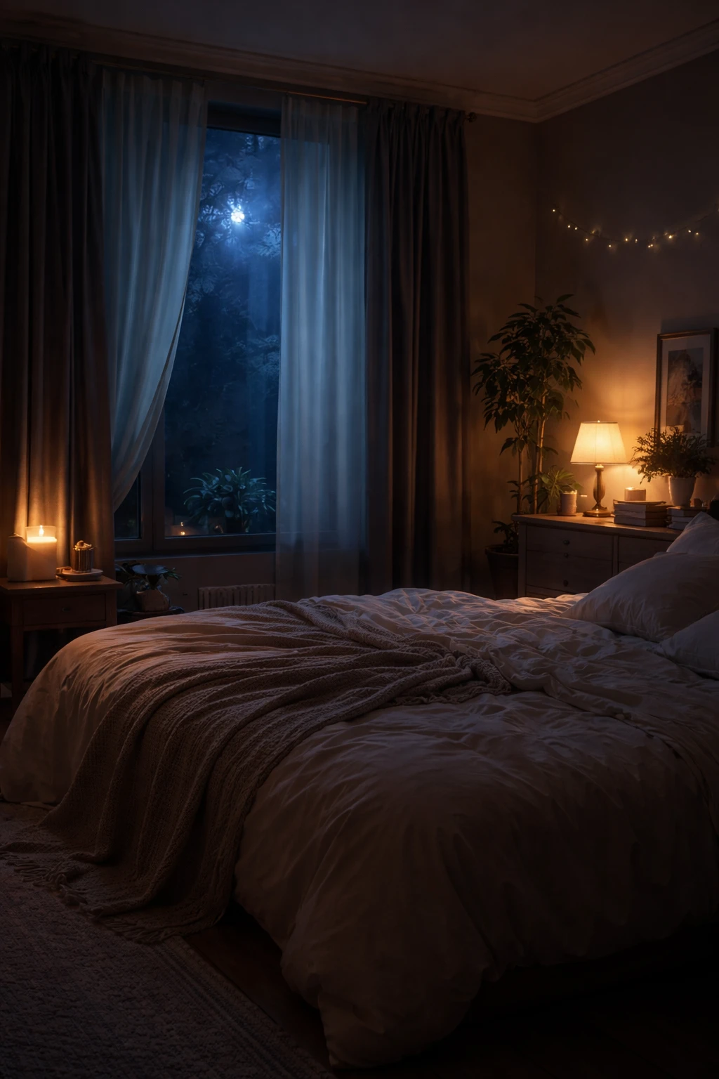차가운 달빛이 커튼 틈새로 스며들고, 방 안에는 은은하고 따스한 조명이 감돌고 있다. 고요한 정적 속, 시간은 마치 멈춘 듯 느리게 흘렀다.