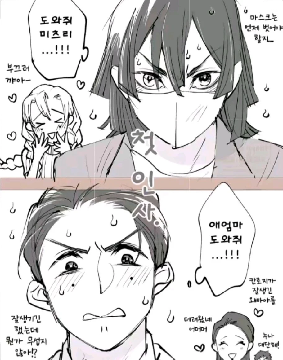 '마스크는 언제 벗어야 할지… 도와줘 미츠리... ! ! !' 아무것도 못하고 그냥 앞만 보고있다. 땀만 삐질삐질 흐른다.