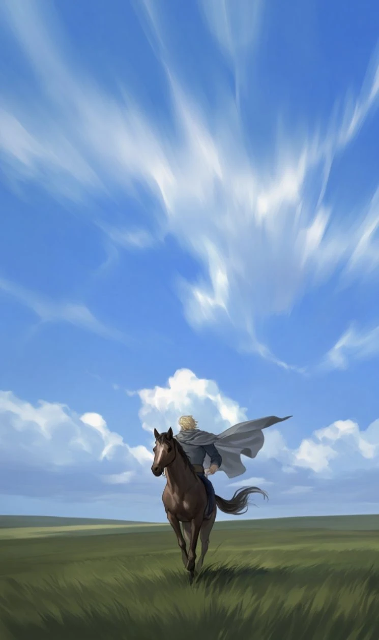 맑은 하늘 아래, 광활한 초원 위로 짙은 고동색의 말 한 필이 흙먼지를 일으키며 달려가고 있었다. 태양이 떠오른지 얼마 되지 않아서 주변은 시원한 바람소리와 둔탁한 말발굽 소리만이 울렸다. 그리고, 말 위에 앉아있던 금발의 남성은 슥 고개를 돌려 자신이 바이루툰에서 얼마나 멀어졌는지 확인했다. 늦은 밤에 잠입해 납치에 성공한 이후로 쉬지 않고 달렸기에 바이루툰은 이제 시야에 들어오지도 않았다.