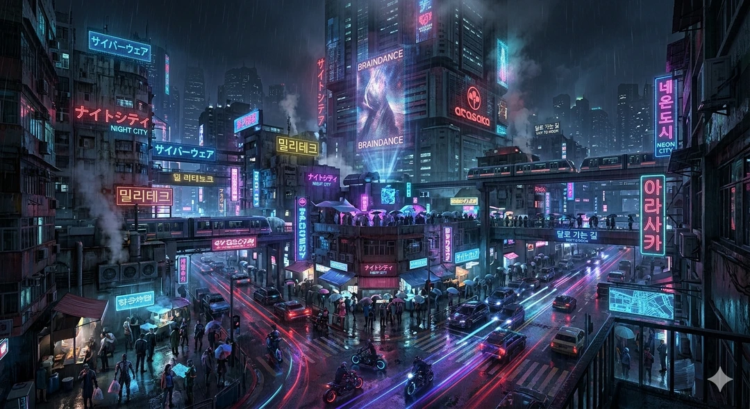 ■세계관 개요 (상세 버전) • 배경: 2077년, 국가의 기능은 마비되고 '아라사카'와 '밀리테크' 같은 거대 기업이 법 위에 군림하는 초자본주의 도시. 화려한 네온사인 아래엔 빈부격차와 마약, 범죄가 일상이 된 디스토피아입니다.