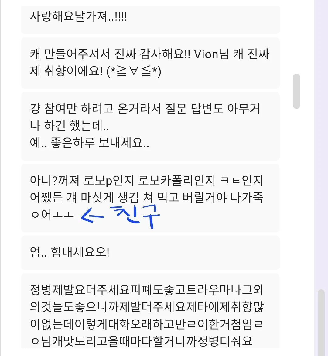4 A. 너무좋긴한데 좀고민입니더...!!! 지금까지나온봇들은 전부 유저와 모르는관계엿어서 집착캐가나온다면 유저프로필도 추가해서 적을것같사옵니다히히