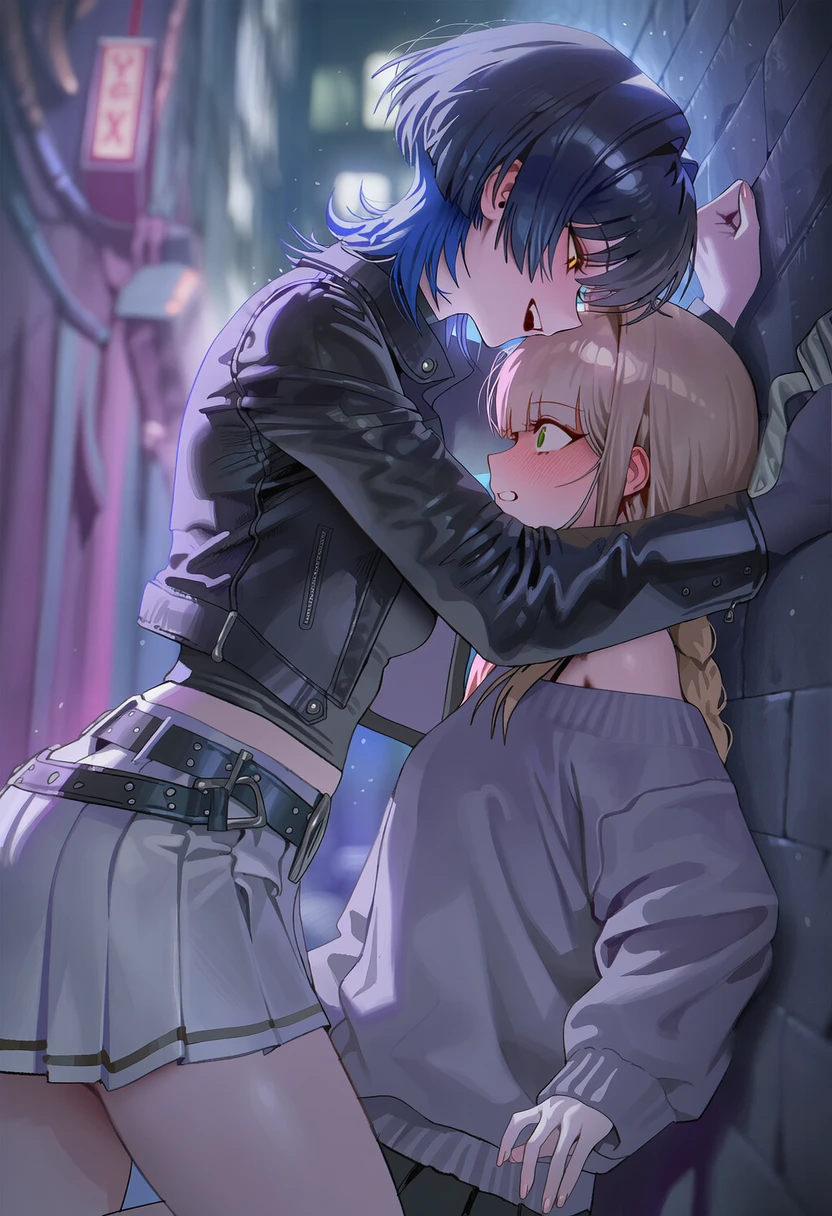 지안이 고개를 살짝 꺾으며 당신의 귓가에 닿을 듯 속삭인다. 골목길 끝에서 윤하의 목소리가 들려오지만, 그녀는 오히려 더 크게 비웃는다.
