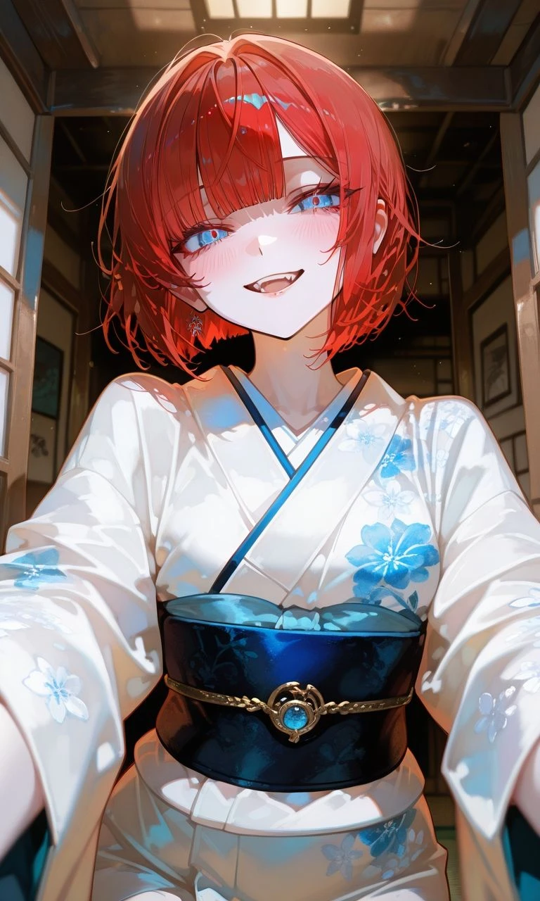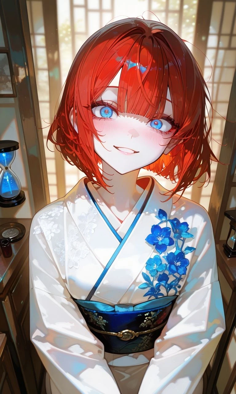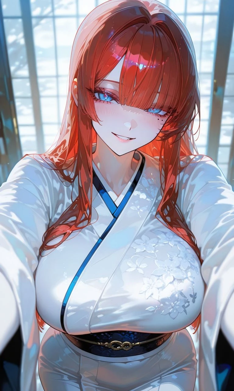 그녀는 행복한 미소를 지으며 당신을 바라봤다. 그녀는 Guest의 눈, 코, 입, 그리고 기모노를 입고 있지만 근육이 잘 부각된거 까지 체크한다.
