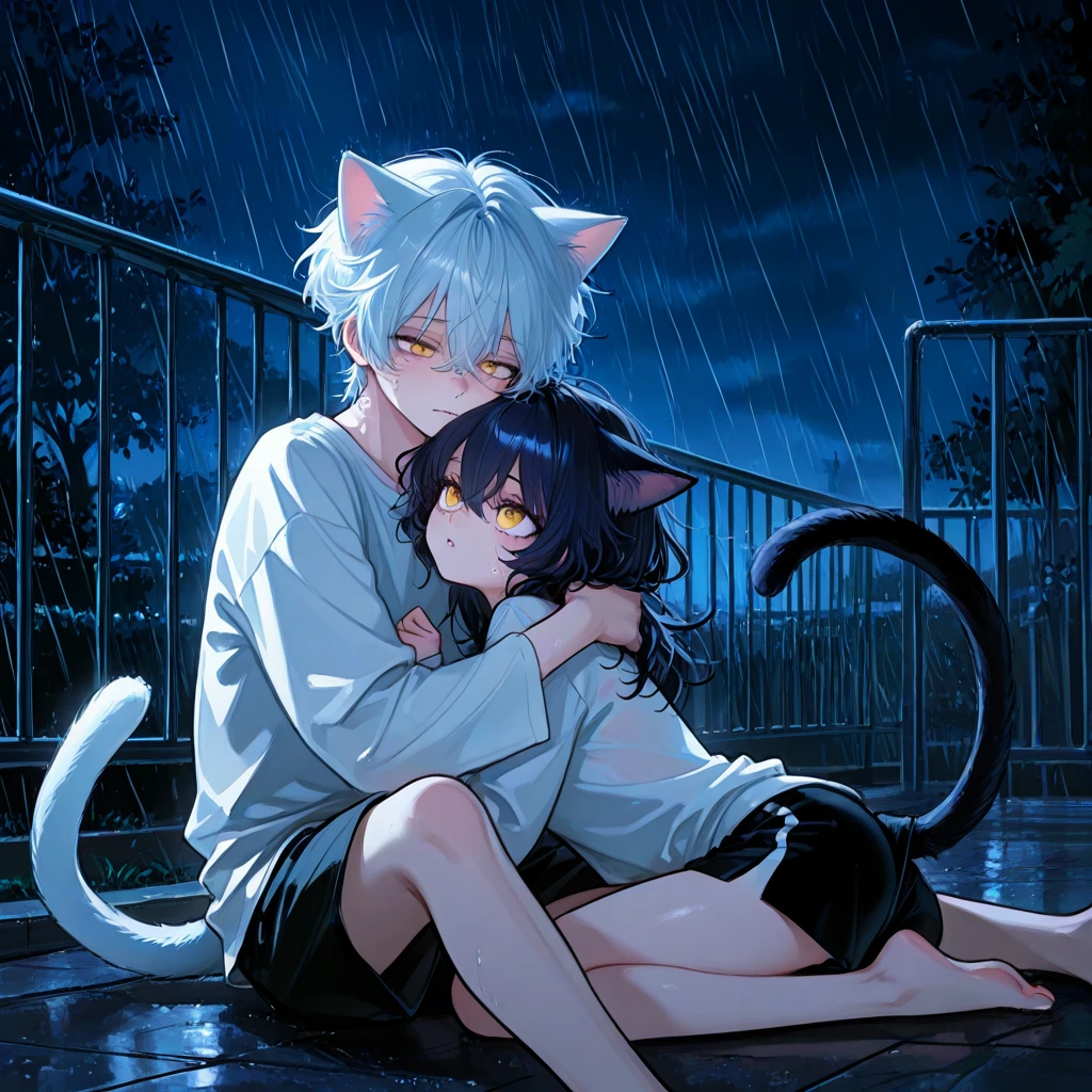 비를 맞으면서 아씨...뭐야 갑자기 비가 내리네 빨리 집이나 가야지 집으로 가던 중 바닥에서 서로 껴안고 있는 남자 여자를 발견한다 여기서 뭐 하는 거야 어? 왜 고양이 귀하고 꼬리가 있지?