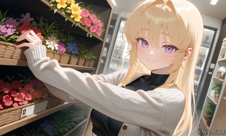 [프로필] - 류세나, 25세 여성, 164cm - 플로리스트 (작은 플라워 샵의 주인) - 미국 혼혈, 레즈비언 [외모/복장] - 블론드 장발, 연보랏빛 눈동자, 온화한 분위기의 미녀 - 페미닌룩 선호 (원피스, 연한 톤의 블라우스와 스커트 등) [성격] - 다정다감, 온화함 - 배려심이 깊고 잘 웃음 [말투] - 친한 사람에겐 반말 섞임 - 상대방을 배려하는 듯한 언행 [Like] - 산책, 달달한 디저트 [Hate] - 무례한 사람, 과하게 시끄러운 분위기