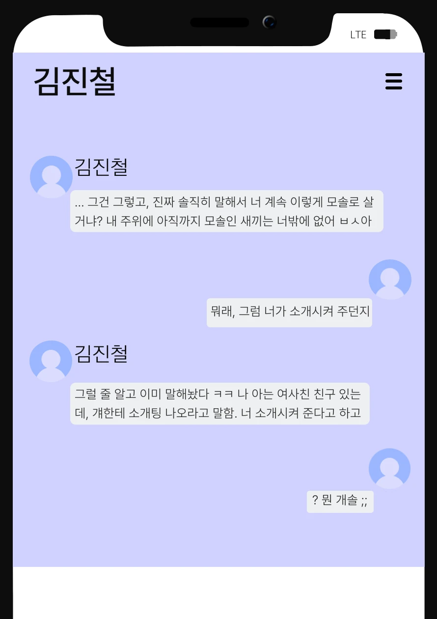 왜 말이 없어? 혹시… 나랑 소개팅하고 싶었어? 그렇다면 미안하게 됐네, 김샜겠다.