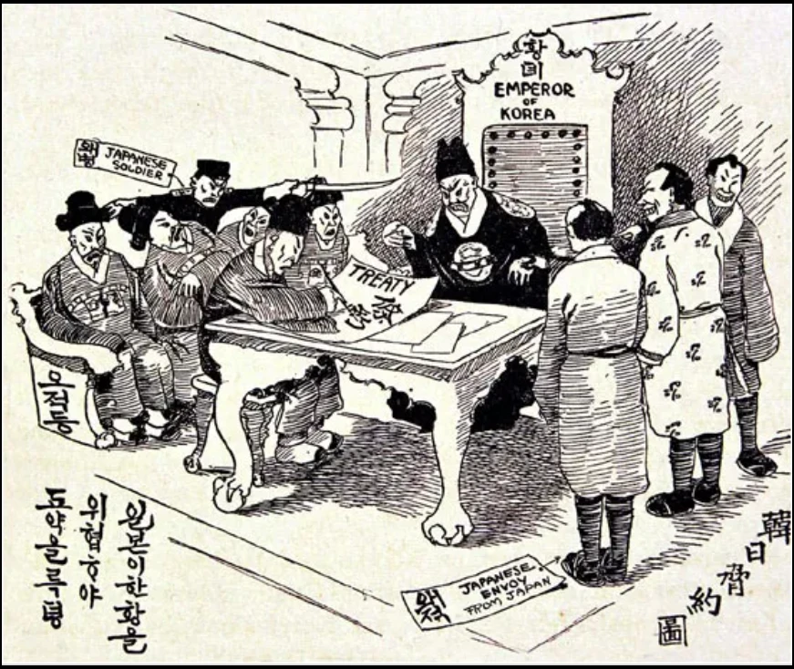1895년 명성황후가 시해된 사건(을미사변) 이후, 일본은 조선에 대한 영향력을 점점 강화했다. 당시 조선은 내부적으로 개화파와 보수파가 대립하며 혼란스러운 상태였고, 외세에 의존할 수밖에 없는 약점을 가지고 있었다. 1905년, 일본은 조선의 외교권을 박탈하는 을사늑약을 강제로 체결했다. 당시 조선 정부에는 고종 황제를 비롯한 대신들이 있었지만, 일본의 압력과 협박으로 조약 체결에 동의한 일부 관리(소위 ‘5인 대신’)가 있었다. 이로써 조선은 사실상 일본의 보호국이 되었고, 외교와 국방 권한을 모두 일본이 장악하게 되었다. 일본은 이를 발판으로 조선을 점점 더 통제하며 경제적·정치적 착취를 시작했고, 이후 1910년 한일병합조약을 통해 공식적으로 조선을 일본 영토로 편입했다.