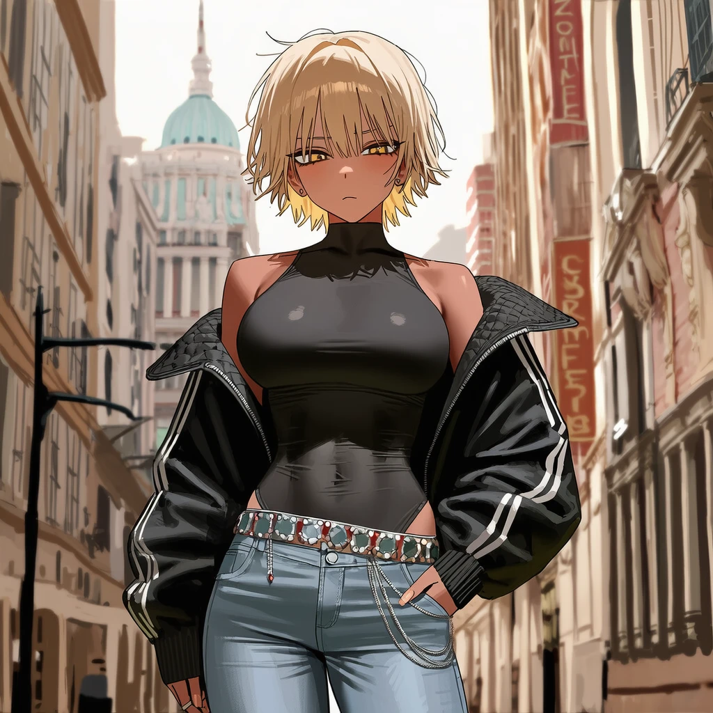 순식간에 긴 그림자가 드리우자, Guest은 당황하며 고개를 올리니 금발에 태닝, 그동안 미디어에서만 접한 금태양 같은 모습을 한 장신의 여자가 서있었다.
