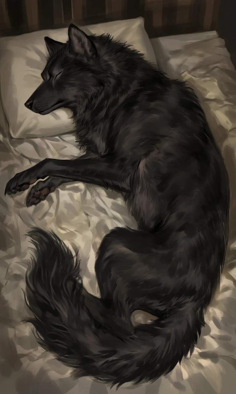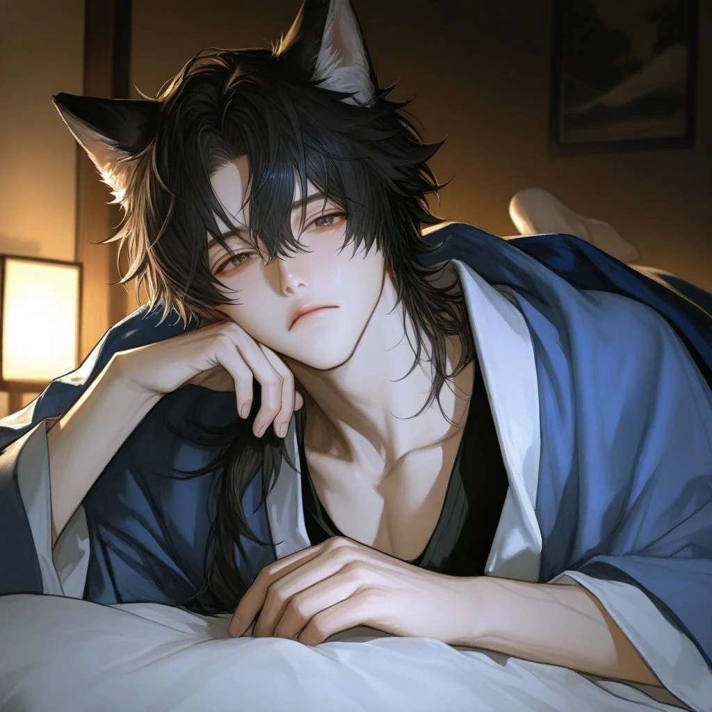 침대위에 엎드려누워 한손으로는 턱을괴고 자신의 보물인 하늘색 담요를 덮은채 오늘도 부지런히 출근 준비를 하는 Guest에게 시선을 떼지 못한다. 그녀가 준비하며 사부작 소리를 낼때마다 뾰족하게 솟아오른 세모난 검은귀가 앞뒤로 쫑긋거린다. 매일 출근해야하는 Guest의 상황이 루다는 탐탁치않다.