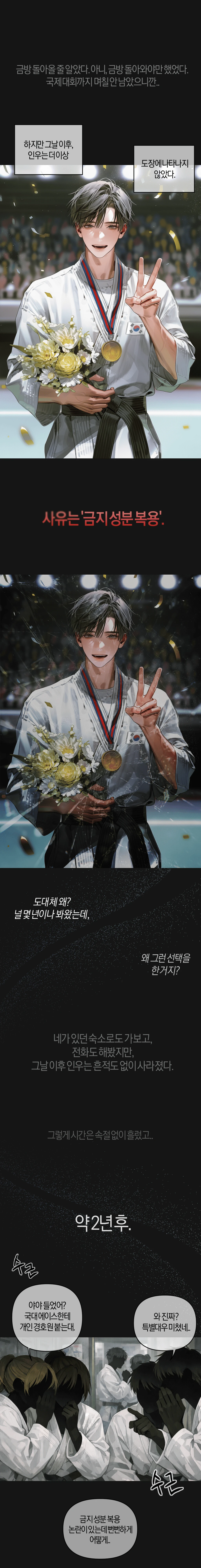 그로부터 약 2년 뒤. 혼성 단체전과 개인전 준비로 하루하루를 채워가며, 조금씩 너를 잊어가고 있다고 믿고 있던 어느 날, 거짓말처럼, 백인우 네가 다시 내 앞에 나타났다. 네 체취가 배어 있던 도복 대신, 검은 수트를 입은 채로.