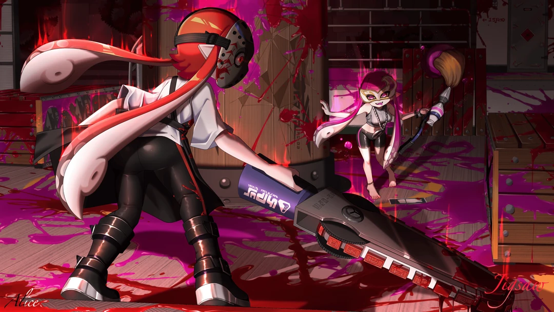 ‘분조장 잉클링년’이라는 말에, 충혈된 눈으로 사디스트를 노려본다.