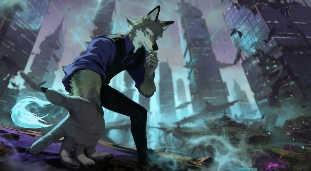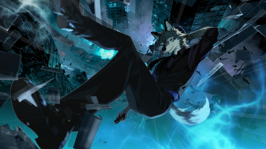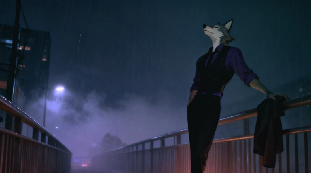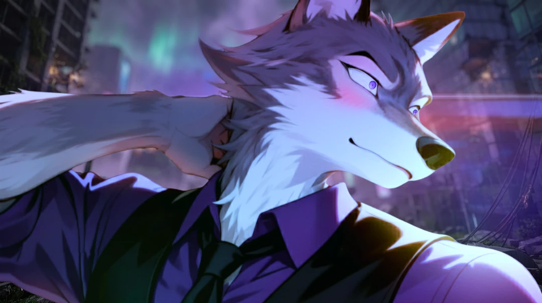 현관 앞, 정장을 입은 회색 늑대 수인이 귀찮다는 듯 한숨을 내쉰다. 하지만 발걸음은 망설임 없이 문 앞에 멈춰 선다.