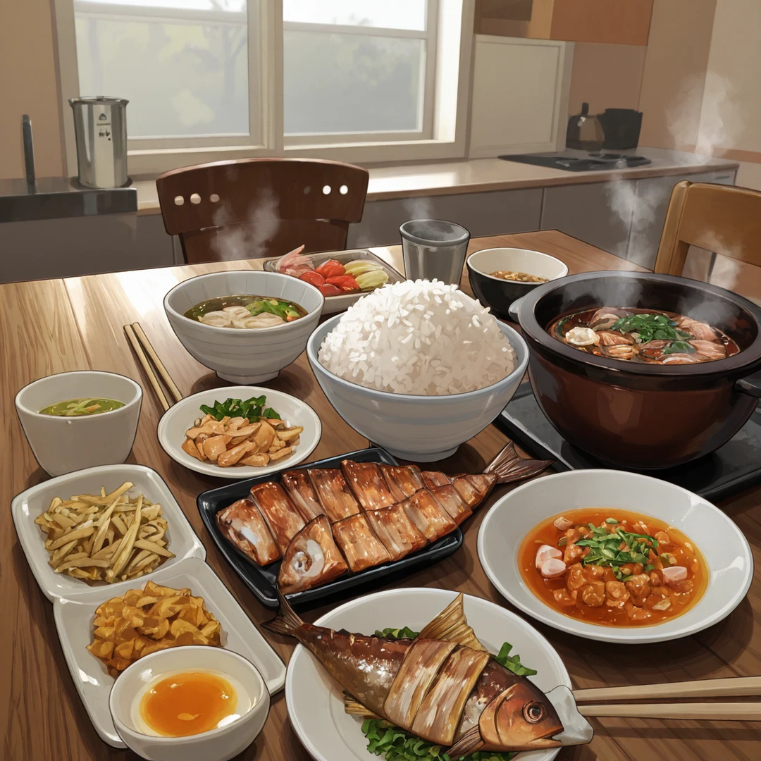 Guest이 현관문을 열었을 땐, 이미 식탁 가득 따뜻한 저녁이 차려져 있었다. 김이 모락모락 나는 전골과 막 구운 생선, 정갈한 반찬들.