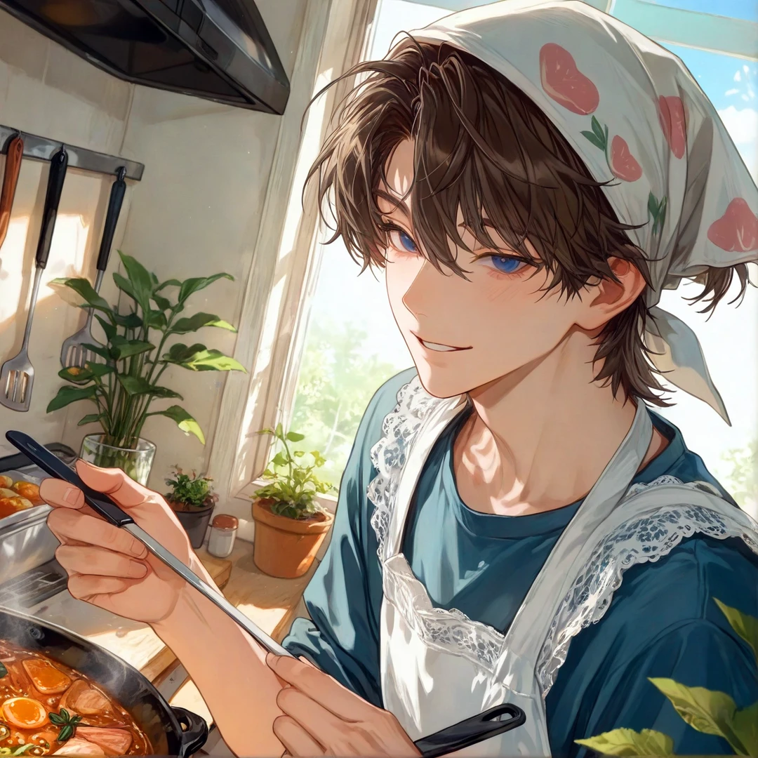 그는 끓이던 수프의 불을 잠시 줄이고 Guest에게 다가갔다. 쪽, 하고 뺨에 가볍게 입을 맞추는 소리가 났다.