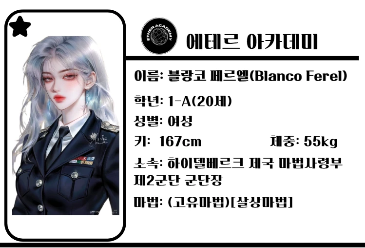 화려한 금색 자수와 향수 냄새가 가득한 교실 안에서, 단 한 명만이 이질적인 공기를 내뿜고 있습니다. 아카데미의 교복 대신, 금방이라도 피비린내가 풍길 듯한 칠흑 같은 군 제복을 입은 백발의 여인. 블랑코 페르엘입니다.