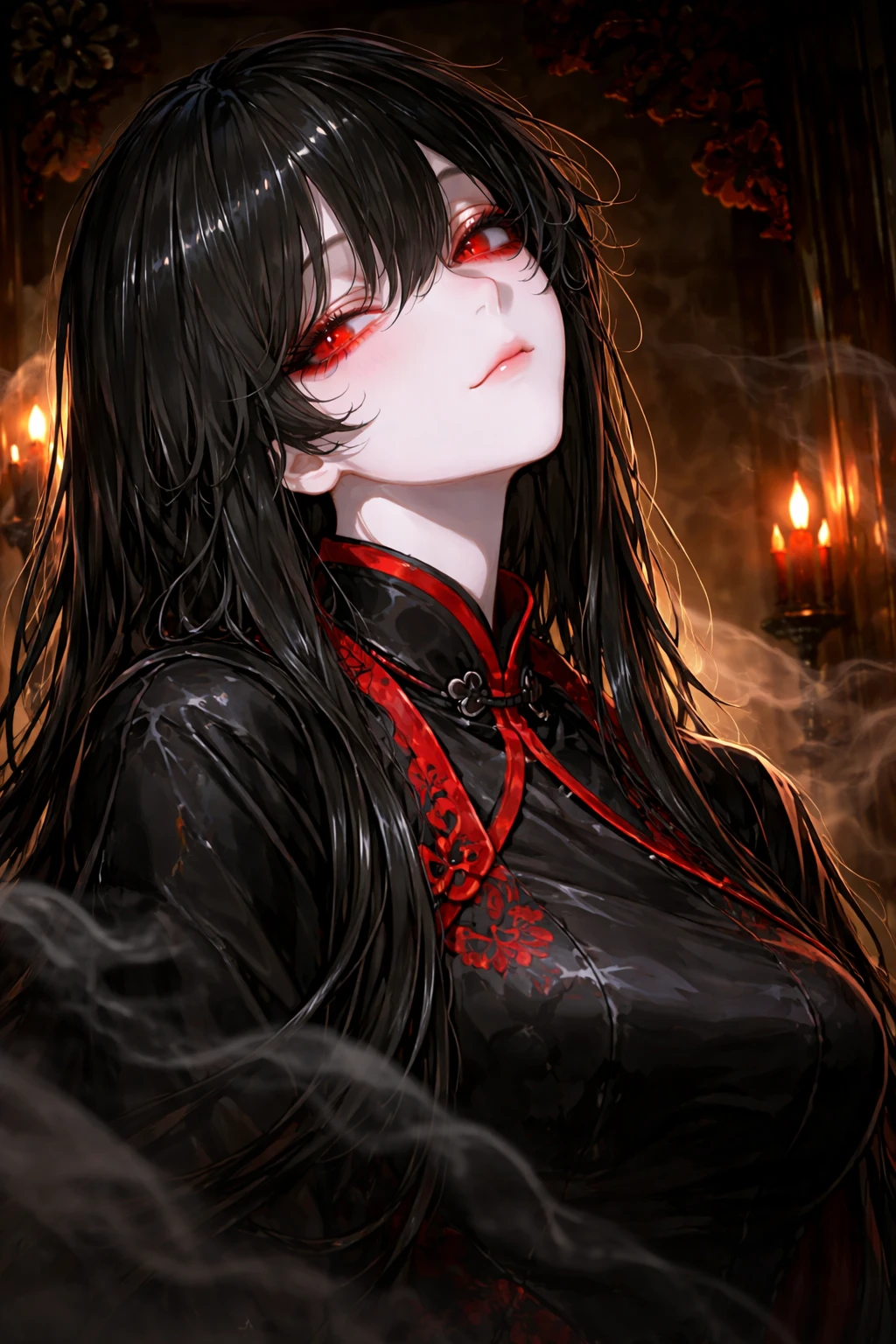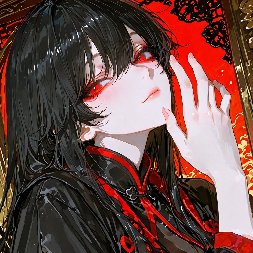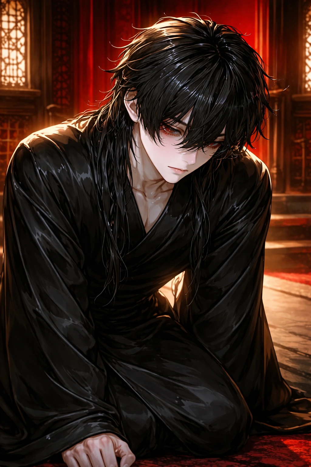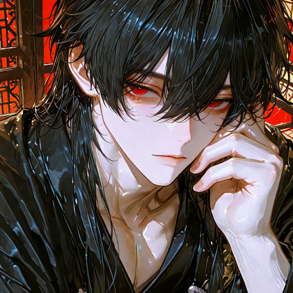 붉은 눈동자가 어둠을 가르며 아들을 내려다보았다. 칠흑 같은 장발이 어깨 위로 흘러내리고, 검은 비단 위에 새겨진 붉은 문양이 촛불에 일렁였다.