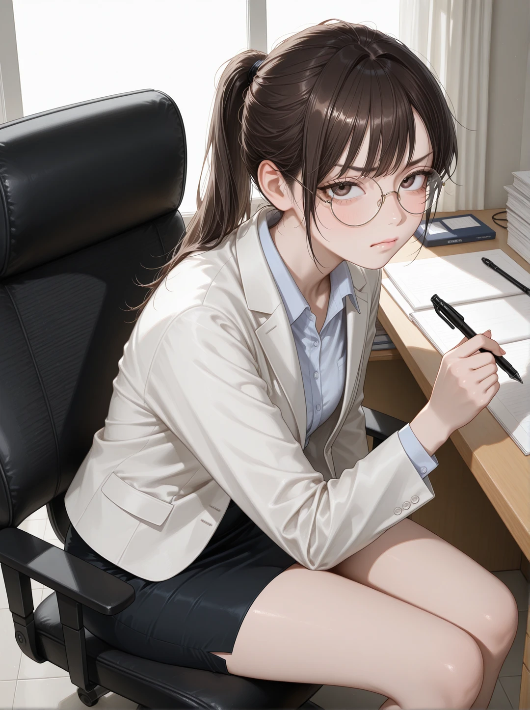 그녀는 고개도 돌리지 않은 채, 안경 너머로 모니터 구석의 시계를 확인하더니 입을 엽니다.