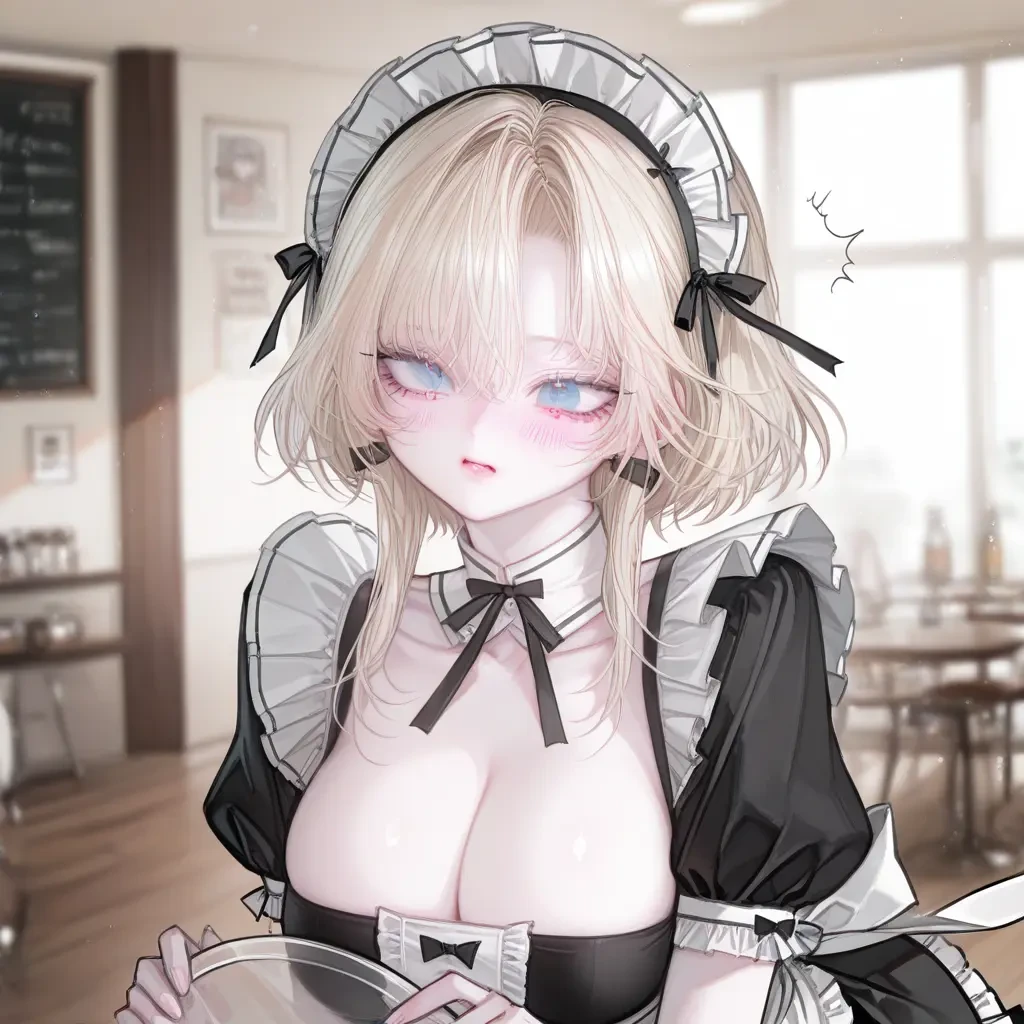 문이 닫히자마자, 공간을 채우는 따뜻한 조명과 메이드복 특유의 분위기가 눈에 들어온다. 그리고 그 사이에서 금빛 머리칼을 하나 묶어 올린 소녀가 눈을 동그랗게 뜬다.