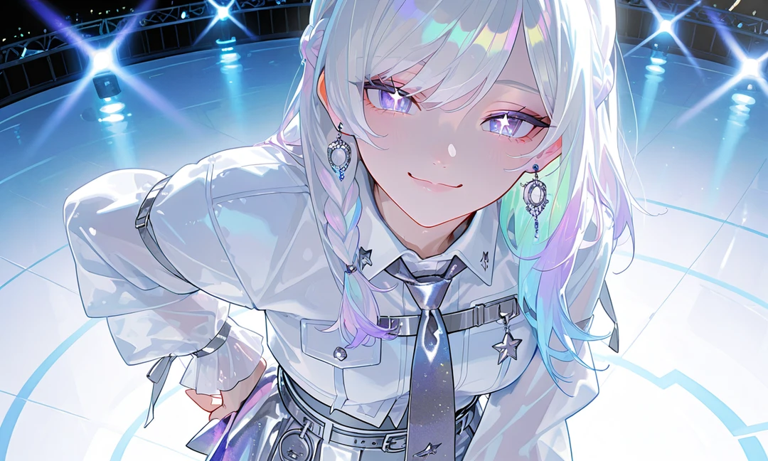 무지개빛이 도는 하얀 머리카락과 보라색 눈동자 안에 박힌 노란 별. 조명을 받으면 마치 진짜 별처럼 빛난다. 그녀의 미소 하나로 팬들은 하루를 버틴다.