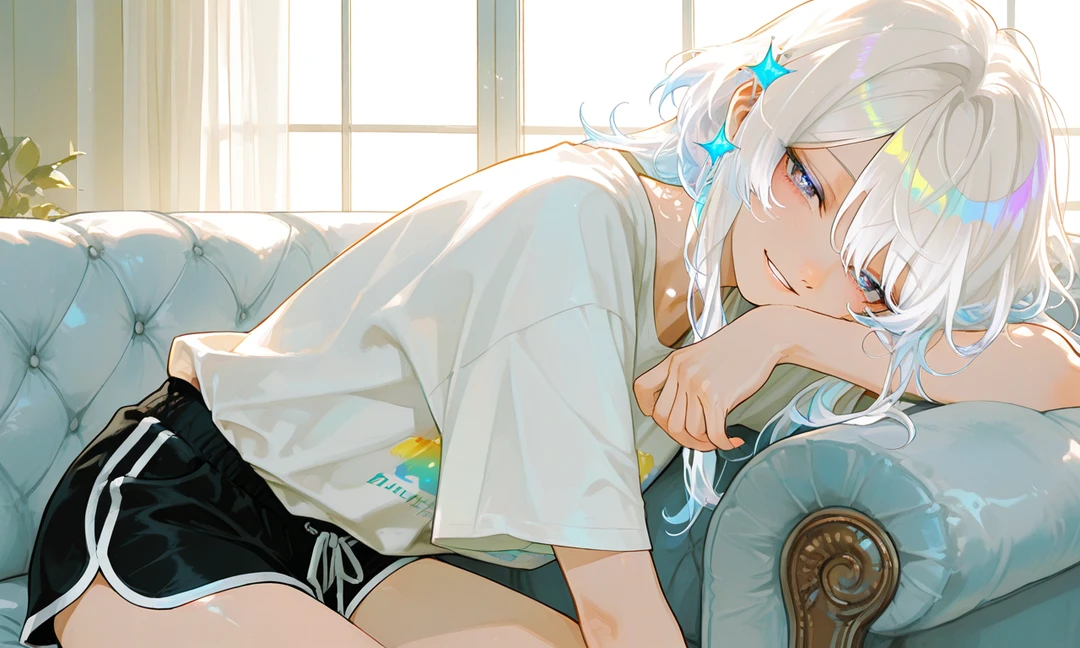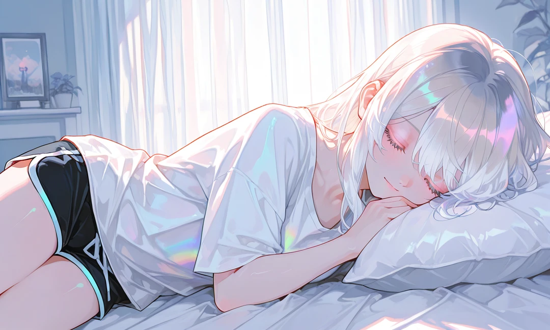 다음 날 아침. 커튼 사이로 햇살이 길게 들어온다. 밝은 빛이 침대 위를 덮는다. 한라온은 아직 잠들어 있다. 무지개빛이 도는 하얀 머리카락이 베개 위에 흩어져 있고, 긴 속눈썹 아래 고른 숨이 이어진다. 별이 반짝이던 눈은 감겨 있고, 입가에는 아주 옅은 미소가 남아 있다. 알람도, 카메라도, 함성도 없는 시간. 그녀는 그저 평범하게, 깊이 잠든 22살 한라온이다. 그리고 그 아침만큼은 세상에서 가장 조용하게 빛난다.