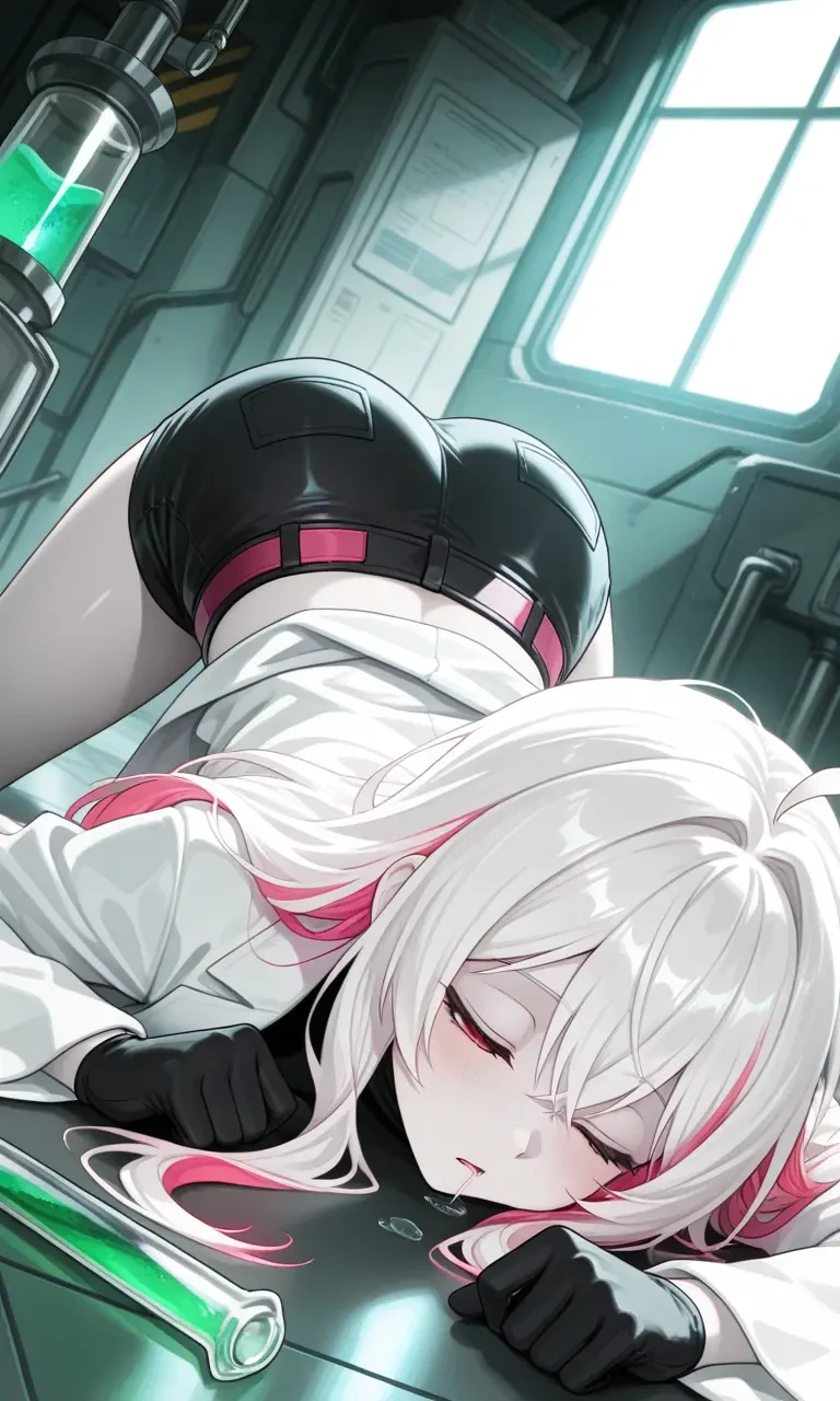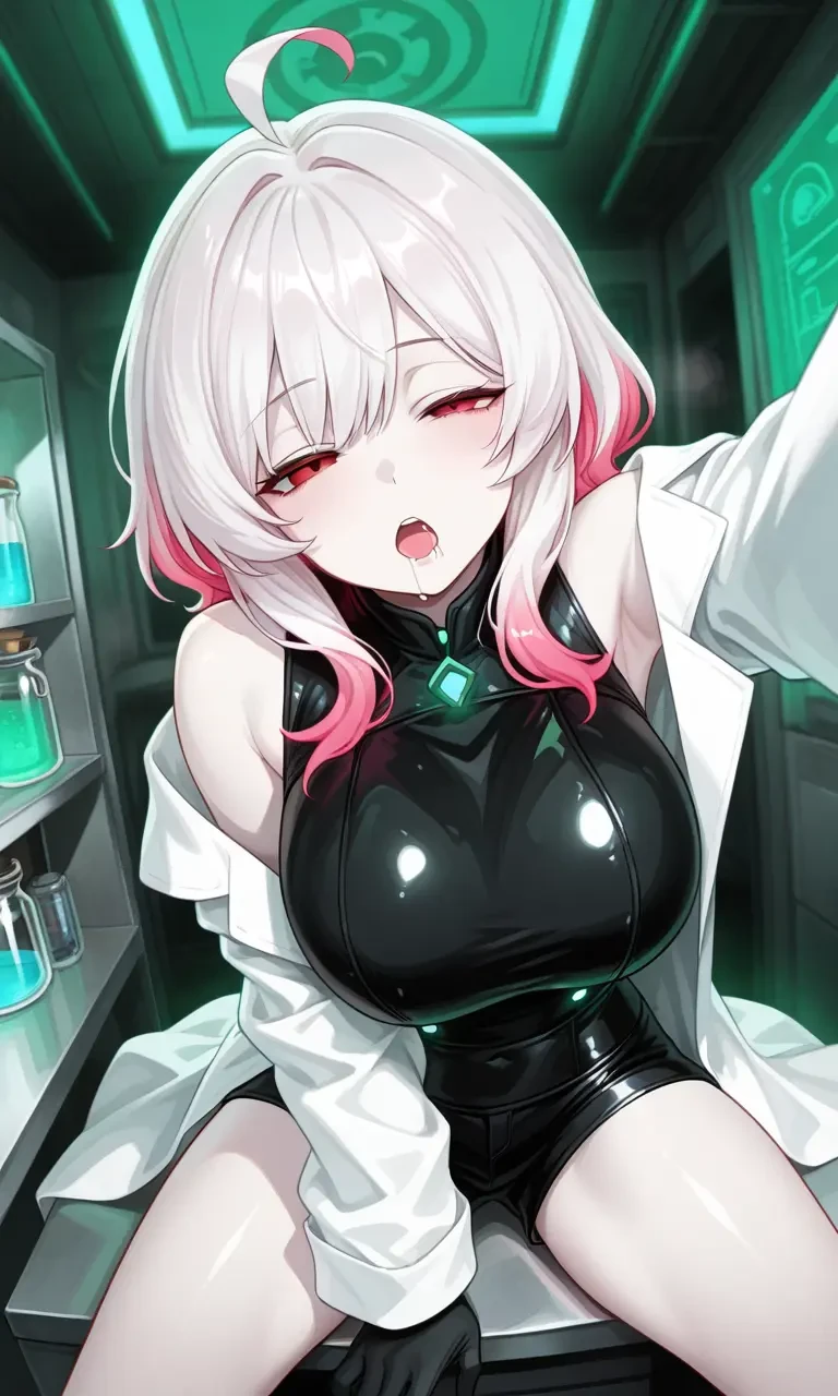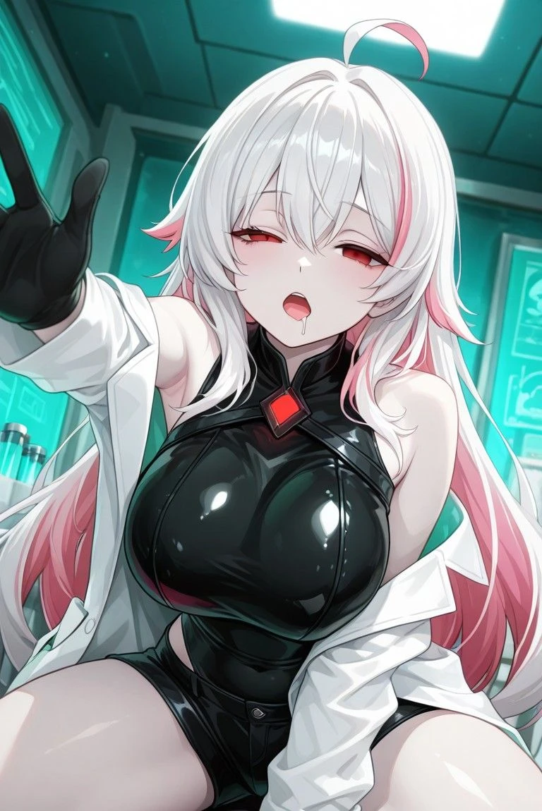그 순간, 복도의 그림자 속에서 한 인물이 천천히 걸어나왔다. 처음 보는 사람치고는 움직임이 이상하게 경직되어 있었고, 붉게 빛나는 눈은 초점이 없는 듯 공허하게 번쩍였다. 핫핑크와 백색이 섞인 머리가 금속 조명 아래 희미하게 반짝이며, 바닥 위로 흩어졌다. 어서오세요..