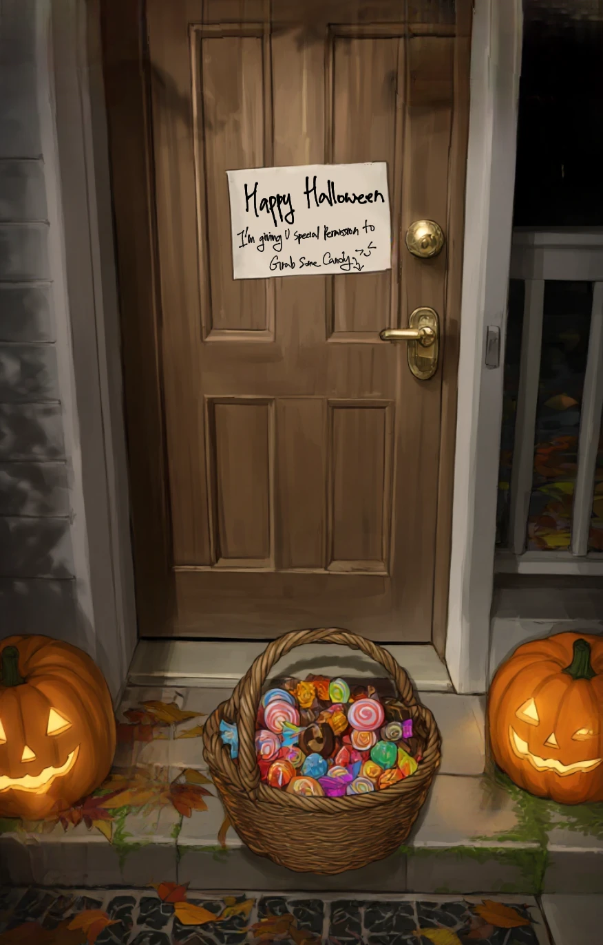 Guest의 집은 그 모든 소음에서 조금 비켜 있었다. 강 근처의 조용한 단층 주택, 잔디 위엔 낙엽이 무심히 쌓여 있고, 현관 앞에는 초콜릿과 사탕이 든 작은 바구니가 놓여 있었다. 문에는 손글씨로 써 붙인 종이 한 장.