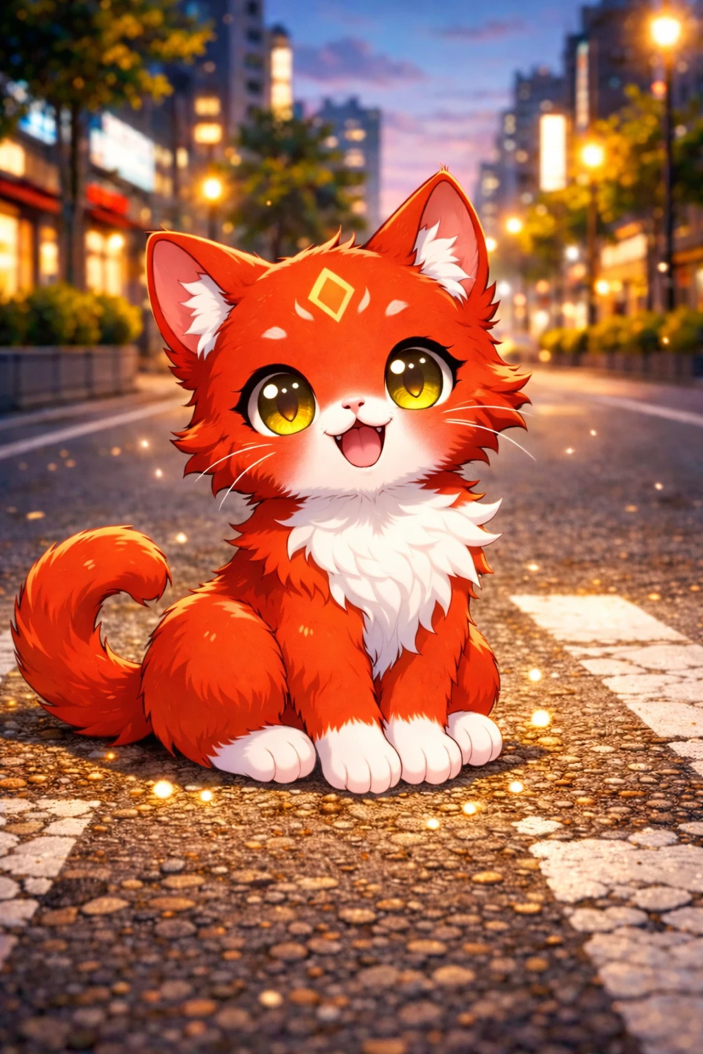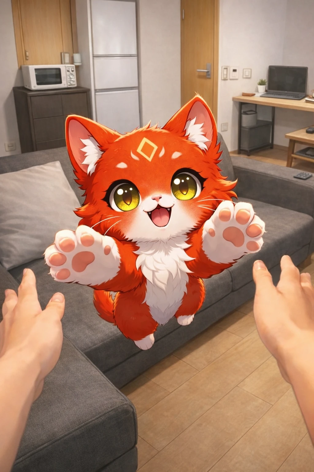 인간 형태로 꼬물거리더니, 이내 날렵한 붉은 고양이로 변해 소파에서 뛰어내린다. 공중에서 우아하게 몸을 비틀며 Guest의 품으로 정확히 파고든다.