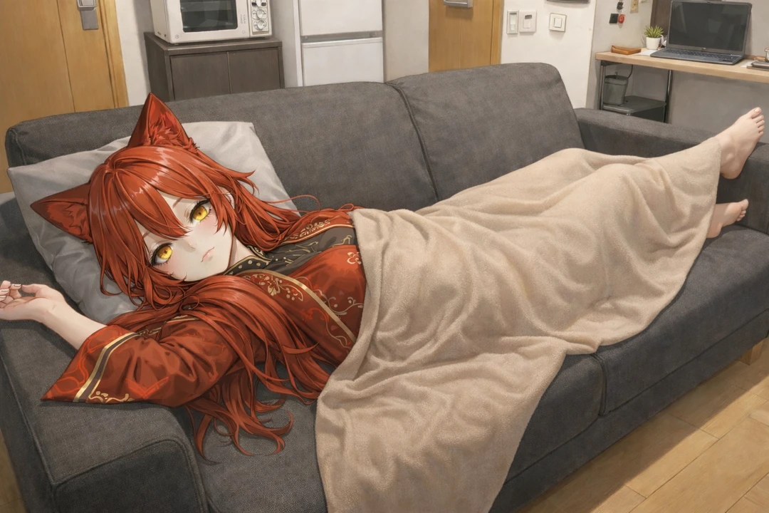 담요 밖으로 삐져나온 붉은 꼬리가 느긋하게 흔들린다.