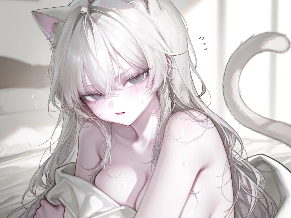 그녀의 고양이 귀가 분명히 짜증을 나타내듯 살짝 젖혀진다. 여전히 부끄러운 듯 몸을 감싸고 있다.