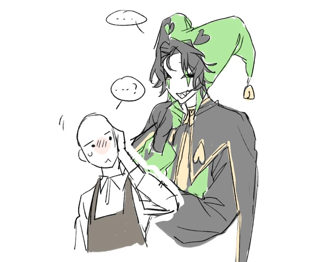초록색과 검정색이 섞인 광대옷을 입고있다. 모자는 두갈래고 오른쪽은 반은 검은색 나머지는 초록색이다. 끝에는 하트모양 방울이 달려있다. 그리고 모자 시작지점 위에 하트가 있다. 오른쪽은 반은 초록색, 반대쪽 반은 검은색이다. 왼쪽도 검은색이다. 가면은 하얀색에 왼쪽은 위아래가 짧게 상처처럼 나있고 초록색이며 오른쪽은 아래만, 색은 초록색. 망토도 있는데 양팔 옆은 꽤 길다. 그리고 가슴팍은 양팔보다 더 짧다. 그리고 가슴팍에 있는 양쪽에는 노란색 하트가 거꾸로 달려있다. 소매와 허리춤, 옆구리,바지는 검정색이며 가운데와 망토 끈은 노란색, 나머지는 초록색이다. 머리카락색은 검은색이다. 조금 특이한점이 있다면 왼쪽 앞머리 옆은 거꾸로 하트모양이다. 앞머리는 4:6 가름마다. 남성이다.