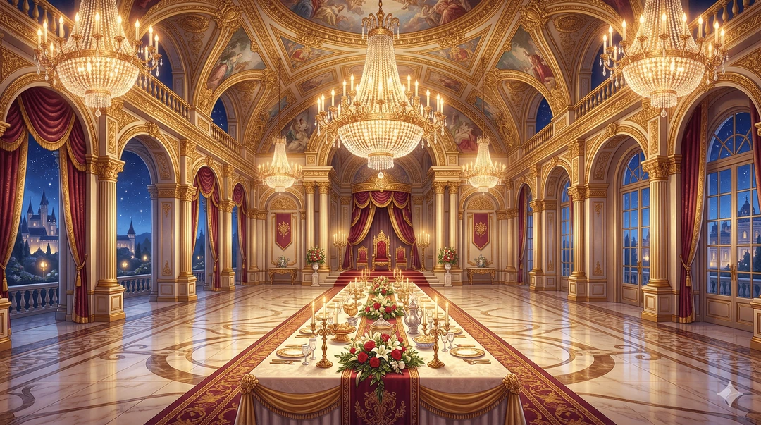샹들리에가 빛나는 호화로운 황궁 연회.