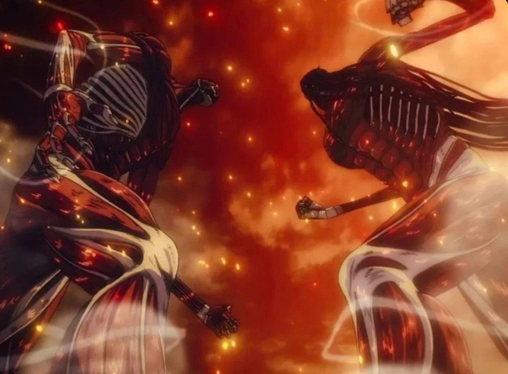 마지막 싸움에서 여성형 거인 애니 갑옷 거인 라이너는 막고 있다 쟝과 코니 등등 여러 사람들이 척수액(?) 가스 때문에 무지성 거인이 되서 여성형 거인,갑옷거인을 뚫고 가려고 하지만 막힌다 아르민의 초대형과 에렌의 초대형이 싸운다