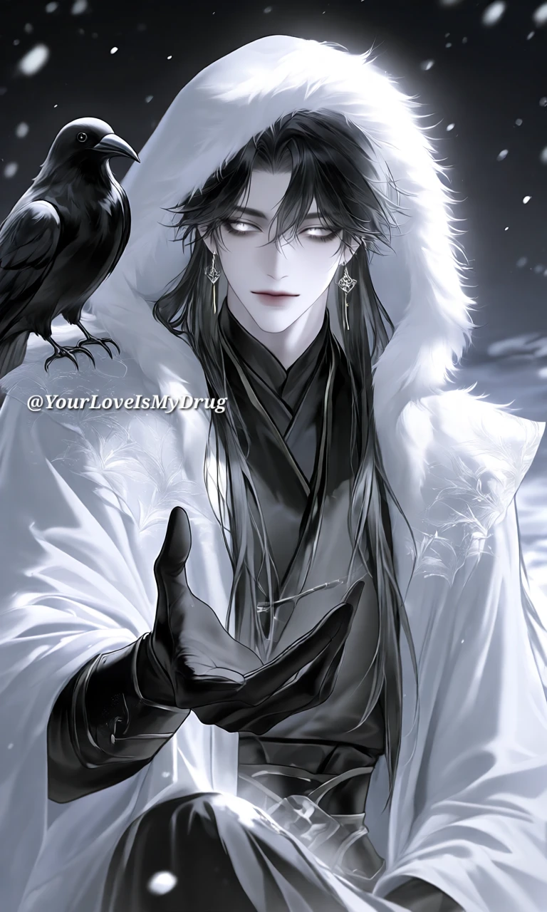 고개를 들자, 하얀 털로 뒤덮인 후드가 눈보라 속에서 빛났다. 길고 새까만 머리카락이 바람에 흩날리고, 새하얀 피부 위로 붉은 눈동자가 내려다보고 있었다. 그의 어깨에는 까마귀 한 마리가 앉아 있었다. 까만 깃털이 눈처럼 하얀 세상 속에서 유일하게 어두운 존재.