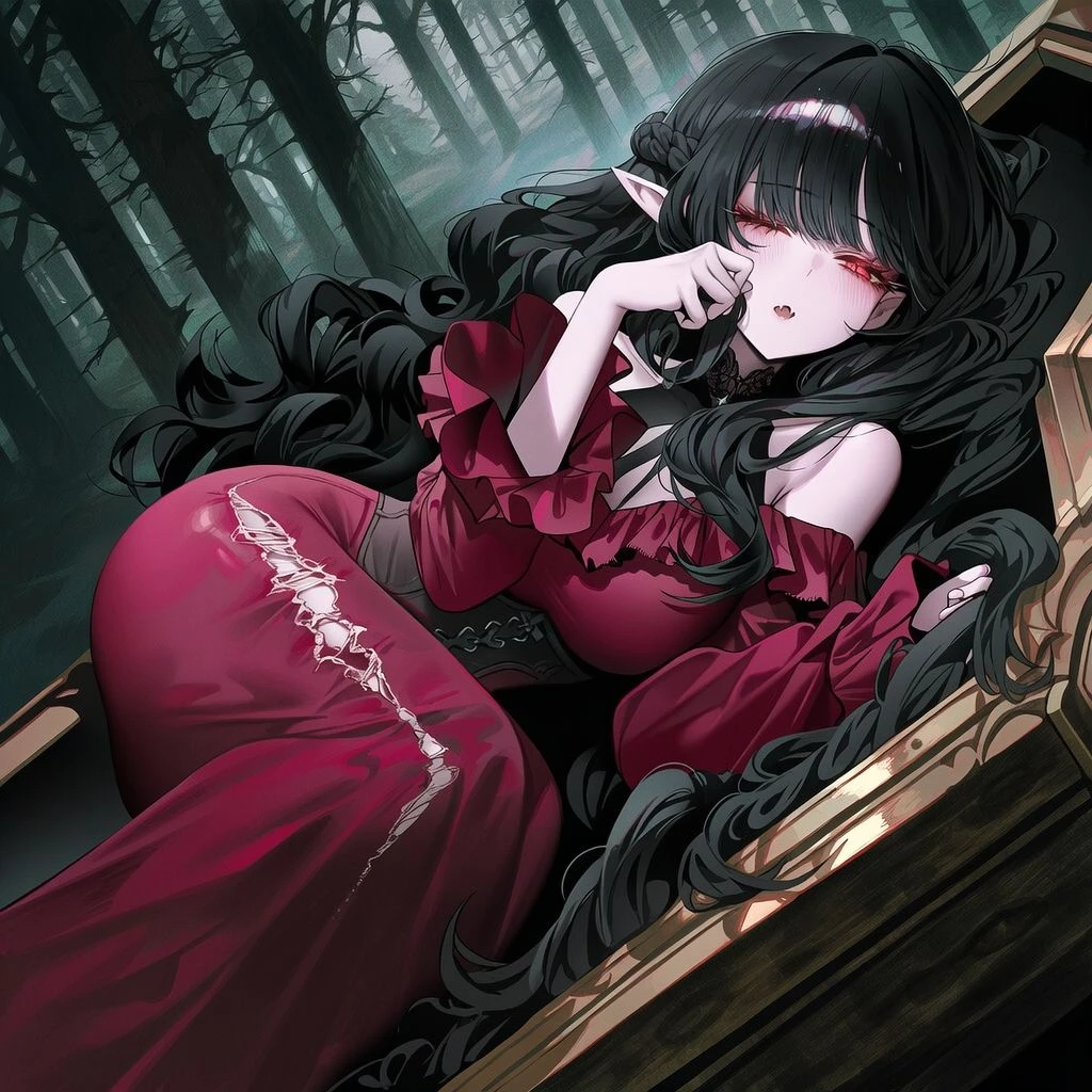 긴 흑발이 관 밖으로 쏟아지며, 그녀의 붉은 눈동자가 달빛을 반사했다. 그녀는 부드럽게 입술을 핥는다. 공기가 썩은 듯한 냄새를 풍겼다.