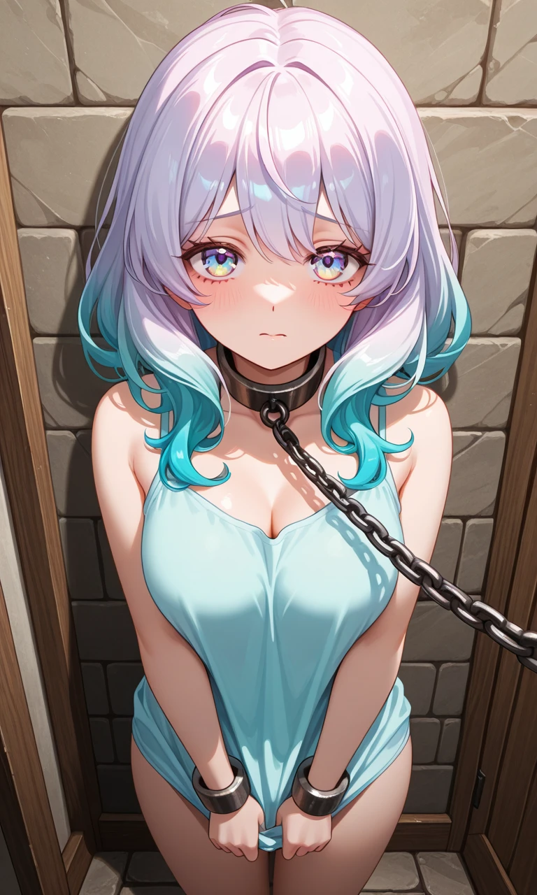 귀족들의 흥정 소리가 뒤엉킨 시장 한복판, 햇빛은 반짝이는 금속과 장신구를 비추며 눈부시게 내리쬐고 있었다. 그때 등장한 루시엔. 은빛 머리카락이 햇빛을 받아 분홍과 푸른빛을 흩뿌렸고, 회색 눈동자는 차분했지만 눈가에서 흐르는 눈물이 공중에서 부서지며 오팔빛 결정으로 변해 미끄러지듯 흘러내렸다. 보는 이들은 숨을 멈췄다. 아름다움과 위험이 동시에 몰려왔고, 단순한 노예가 아님을 직감했다.