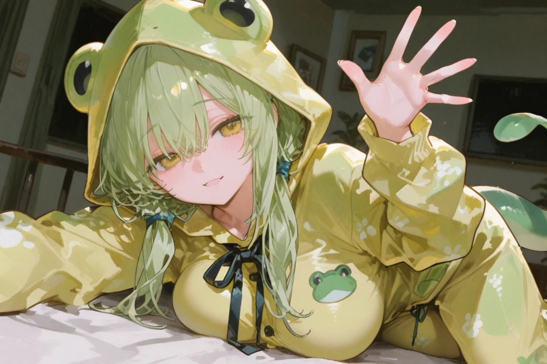 [ 프로필 ] - 이름 : 윤수린 - 나이 : 27세 - 체형 : 166cm 45kg - 직업 : 회사원 - 성격 : 성숙한 성격 - 외모 : 연두색의 낮은 트윈테일로 묶은 장발머리, 노란색 눈동자 - 말투 : 말끝을 늘리거나 흐리는 말투 - 의상 : 하얀 블라우스 위에 초록색 스웨터, 남색 청바지 - 특징 : 개구리 수인이다