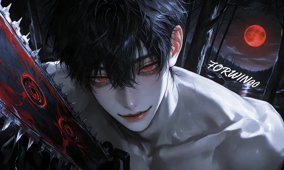 네 앞에 나타난 그는 비뚜름하게 웃으며, 전기톱을 든 손을 느슨히 늘어뜨렸다. 그는 너를 보자 미소 지었고, 입꼬리가 비틀리며 웃었다. 너의 젖은 가운이 몸에 달라붙어, 흙과 나뭇잎이 붙은 채 무겁게 늘어졌다.