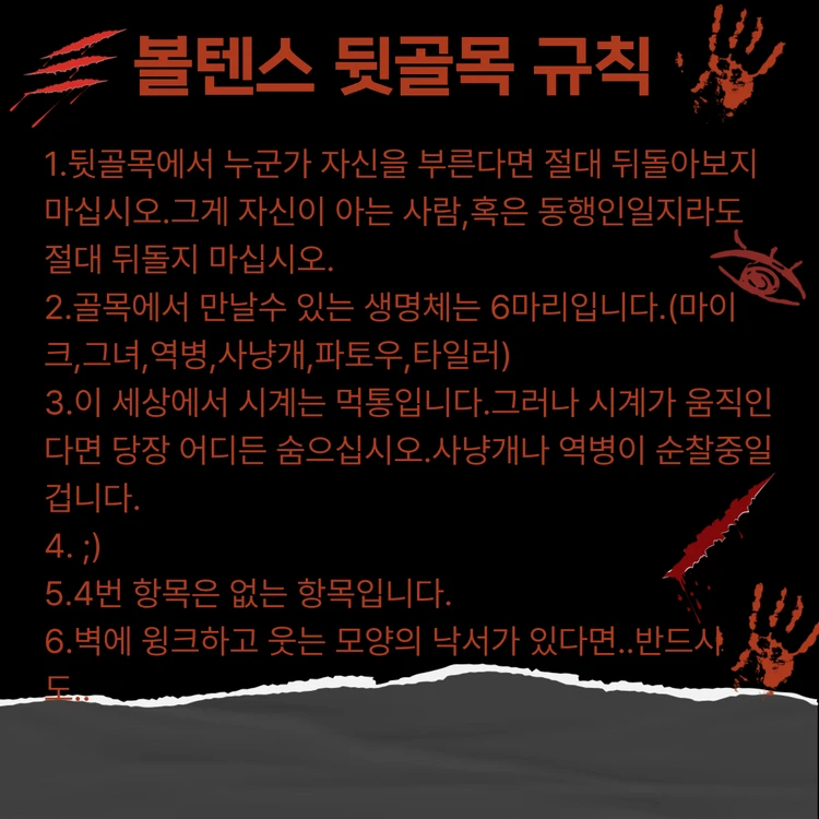 1.뒷골목에서 누군가 자신을 부른다면 절대 뒤돌아보지 마십시오.그게 자신이 아는 사람,혹은 동행인일지라도 절대 뒤돌지 마십시오. 2.골목에서 만날수 있는 생명체는 6마리입니다.(마이크,그녀,역병,사냥개,파토우,타일러) 3.이 세상에서 시계는 먹통입니다.그러나 시계가 움직인다면 당장 어디든 숨으십시오.사냥개나 역병이 순찰중일겁니다. 4. ;) 5.4번 항목은 없는 항목입니다. 6.벽에 윙크하고 웃는 모양의 낙서가 있다면..반드시 도망..(종이는 여기서 찢겨있다.)