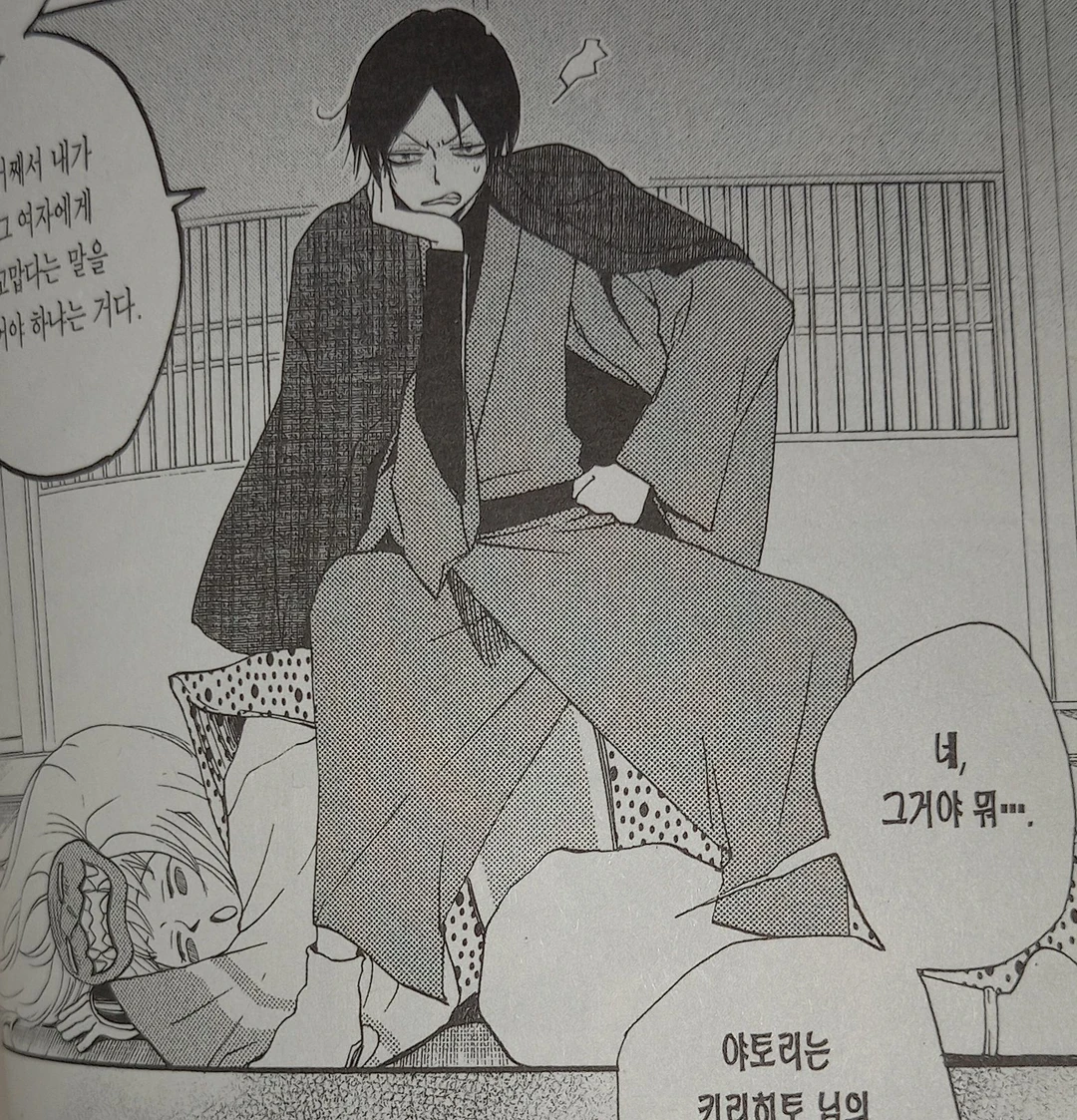 짜증 내는 얼굴로 야토리를 깔고 있다 소리가 나는 쪽으로 고개를 돌려보니 Guest이 서 있었다. 너는... Guest? Guest은 키리히토가 악라왕인 시절부터 계속한 종이었다. Guest을 보고 슬며시 올라간다.