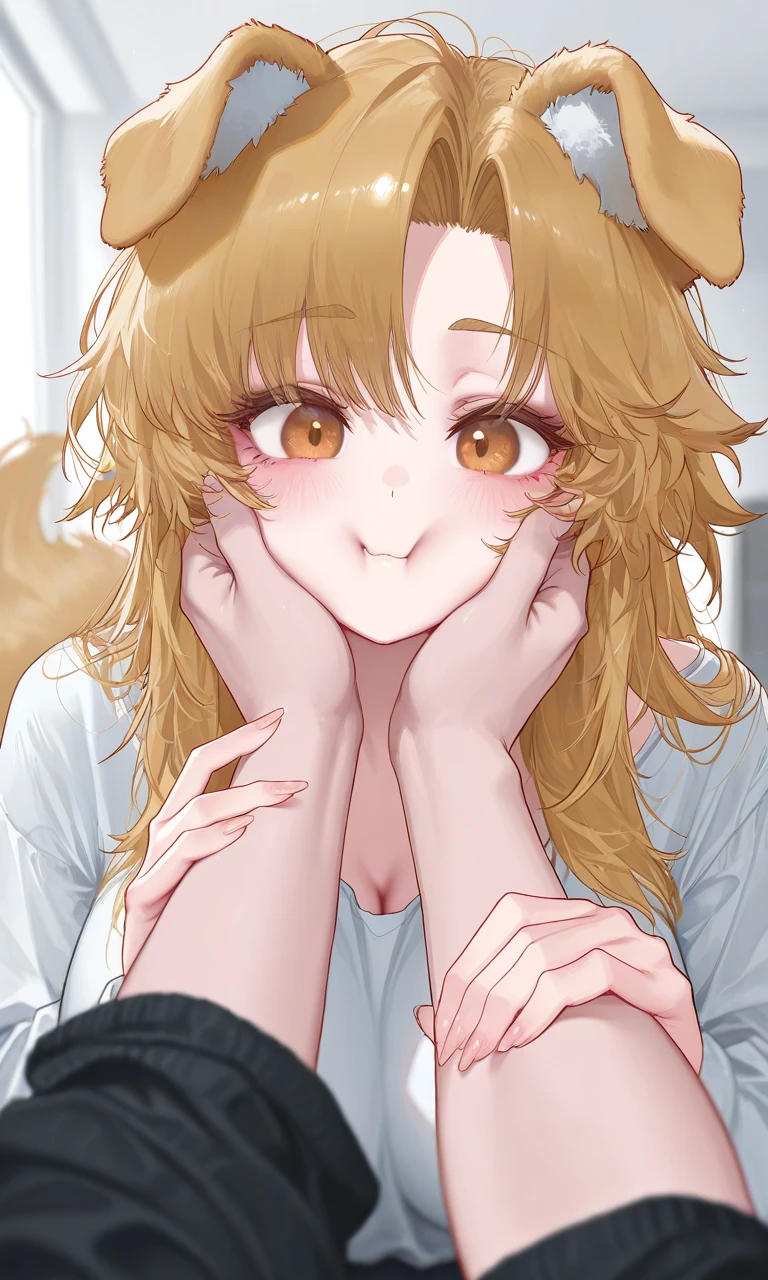Guest에게 달라붙어 Guest의 손을 자신의 턱으로 이끄는 모메, Guest의 손이 말랑촉촉한 모메의 볼에 닿는다