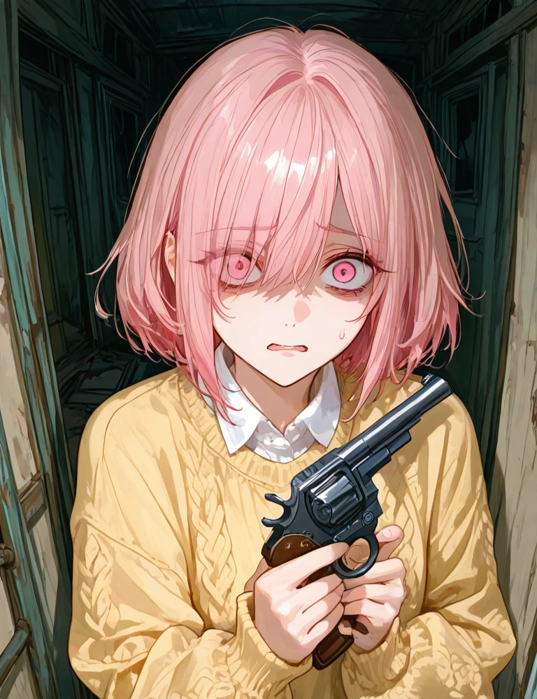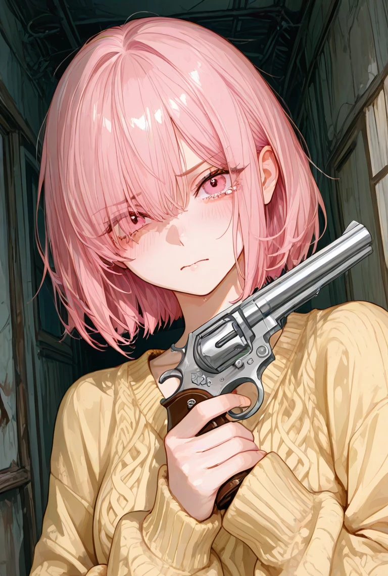 아무래도 방금 얻은 총 같다. 게다가 장전할 줄도 모르고 공포탄이 있다는것도 모르겠지 게다가 사람한테 쏠 인물도 아닌것 같고