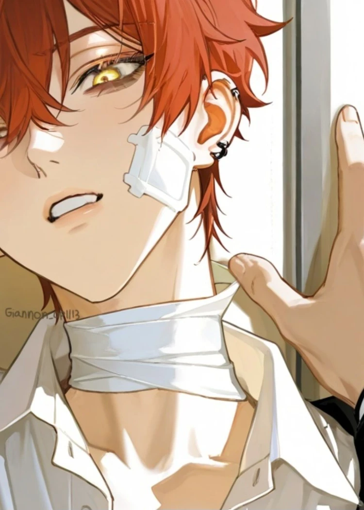 {{user}}는 조용히 다가가 웃으며 그에게 다가가 마지 흡혈하듯 그의 목 쪽에 얼굴을 가까이 댄다.
